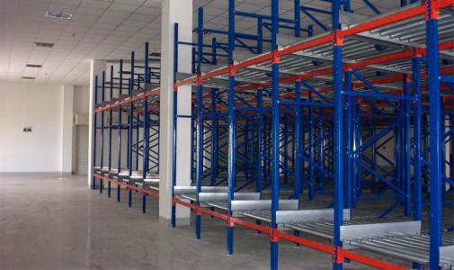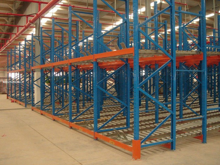 在貨架的組與組之間沒有作業通道,從而增加了60%的空間利用率,提高了倉儲的容積率;托盤操作遵循先進先出的原則;自動儲存回轉;儲存和揀選兩個動作的分開大大提高輸出量,由于是自重力使貨物滑動,而且沒有操作通道,所以減少了運輸路線和叉車的數量